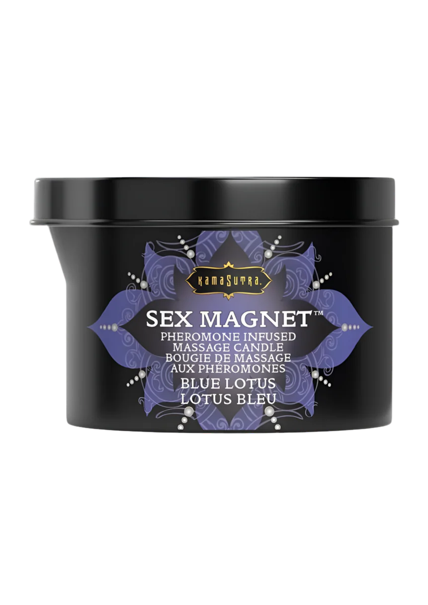 Pheromone infused wax free 6 oz/170 g massage candle made from organic coconut oil, shea butter and Blue Lotus essential oil. Set the mood for desire with the warm, floral Blue Lotus scent. The Blue Lotus flower has been associated with aphrodisiac, mood enhancement and relaxation/stress relief properties. Our enticing pheromone fragrance adjusts to your body's chemistry to create a one-of-a-kind scent that is unique to you. Unisex. Light and let a warm pool of oil melt before pouring on or simply use as a body balm. Candle is in a tin with a convenient POUR SPOUT. Made in the USA