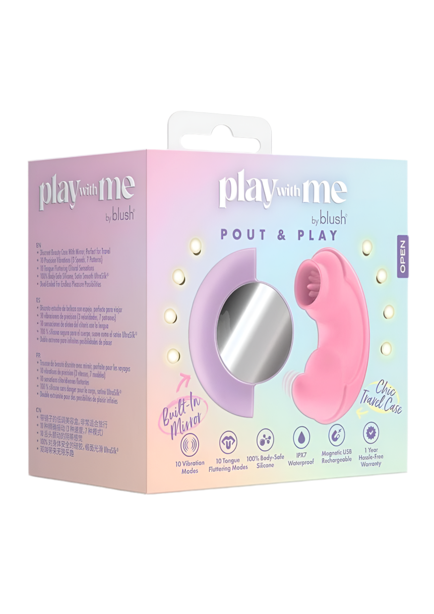 Revel in pleasure and style with the Play With Me Pout & Play. Disguised as a sleek beauty case with a built-in mirror, this chic & flirty, dual-ended vibrator brings you the best of G-spot stimulation and clitoral delight, each with 10 settings to match your every desire. Crafted from 100% premium body-safe silicone and UltraSilk®, Pout & Play glides effortlessly across the skin, delivering its irresistible velvety touch. IPX7 waterproof design and USB rechargeable, carry your confidence and glow wherever you go, embracing flawless pleasure.